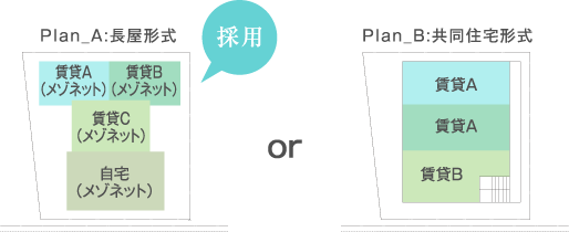作成した企画・建築物図面に基づいて、事業収支表、長期シミュレーションの作成、予算計画を行います。右図においては建築費も安く利回りも良い木造建築に決定しています。